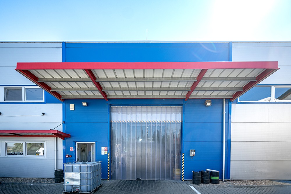 Hale dominuje veľký baldachýn nad dverami a markízy na oknách v tvare L, všetko vo farbe RAL 3000.